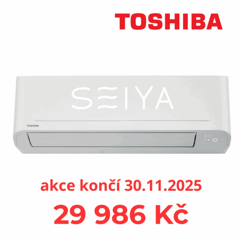 Toshiba Seiya NEW oblíbený model s vynikajícím poměrem cena/kvalita se základním čištěním vzduchu, wifi modul je volitelný, hlučnost vnitřní jednotky od 19 dB. Intuitivní IR ovladač. Nabízí se i levnější varianta Seiya Classic za 23 990 Kč, která není vhodná k vytápění. Cena je včetně montáže a materiálu.